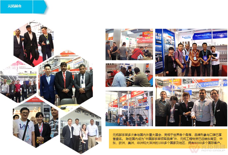 湖南元拓建材集團股份有限公司(簡稱:元拓建材集團)始創(chuàng)于1998年,以工程最前端的腳手架、鋁合金模板等產(chǎn)品為基礎(chǔ),現(xiàn)已發(fā)展成為集房產(chǎn)、工程、材料全產(chǎn)業(yè)鏈服務(wù)及多元化發(fā)展的大型實業(yè)集團。元拓模架產(chǎn)業(yè)鏈板塊(簡稱元拓模架)隸屬于湖南元拓建材集團,提供模架產(chǎn)業(yè)鏈解決方案––全系模架產(chǎn)品(含國際)、模架租賃及托管、勞務(wù)施工、數(shù)字模架、營銷訂單解決方案、應(yīng)收解決方案。 元拓模架深耕全球市場24年,目前擁有天津和順昌、湖北元拓鋁模兩大模架生產(chǎn)基地,長沙、青島、廣州三大子公司,埃及、印尼、迪拜、菲律賓等10多家海外子公司/辦事處。是中國石油、中國石化等世界知名石化施工企業(yè)指定供應(yīng)商和世界各國優(yōu)秀工程施工企業(yè)長期戰(zhàn)略合作伙伴,銷售網(wǎng)絡(luò)遍布多個國家和地區(qū)。