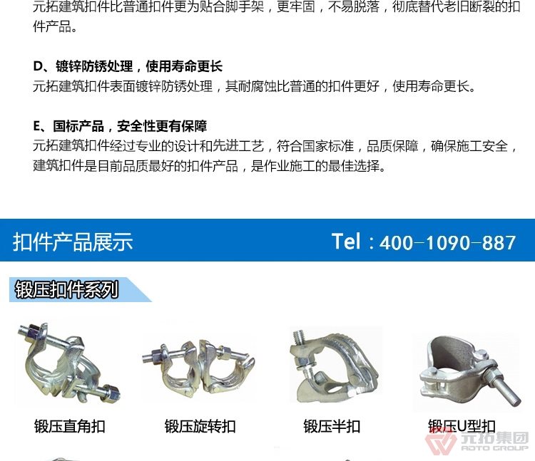 直角扣件的使用方法:直角扣件用于腳手架鋼管的直接連接,選好連接位置,擰緊螺絲,扭力不小于40N;旋轉(zhuǎn)扣件用于腳手架鋼管的斜線連接及有角度連接,使用方法同直角扣件;對接扣件用于鋼管的直線連接,使用方法與上兩種相同.建筑扣件是在建筑施工中,搭建鋼管腳手架及鋼管結(jié)構(gòu)的臨時工棚,井架,模板支撐等作緊固連接用,有體積小,裝拆,運輸方便,省物料等特點.