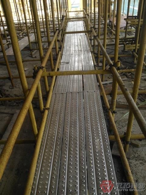規(guī)格相同的腳手板,木跳板的重量是鋼制腳手板的1.5-2倍重量,而且雨天木板吸水后更笨重,且極端不防滑。工人搭架施工時(shí),木板須2人抬運(yùn),而我公司生產(chǎn)的鋼跳板一人可拿2-4片,極大的提高了工作效率,高強(qiáng)度性使得腳手架管的數(shù)量也能減少使用。