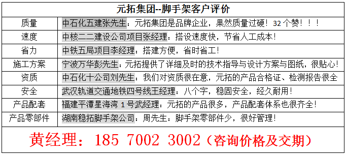 元拓腳手架建筑材料的客戶中,很大一部分是老客戶。為什么客戶定購(gòu)過(guò)一次的,會(huì)一而再,再而三的選擇元拓腳手架建筑材料呢?因?yàn)榭蛻魧?duì)元拓腳手架的評(píng)價(jià)是:元拓腳手架滿堂腳手架好用不貴,價(jià)位合理,經(jīng)久耐用,而且服務(wù)一流,品牌響亮。 元拓腳手架碗扣式多功能滿堂…