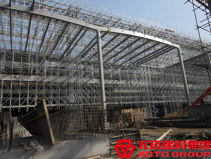 盤扣腳手架因受力性能好,單位體積用鋼量約為碗扣式腳手架的40%,所以在設(shè)計(jì)較高的支撐體系適合使用盤扣腳手架。