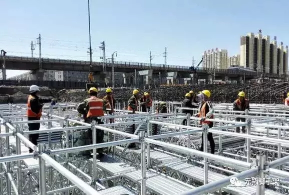 以中鐵六局承辦的內(nèi)蒙古呼和浩特市鐵路下穿立交橋項(xiàng)目為例,該項(xiàng)目就是使用元拓的圓盤式腳手架支撐體系來(lái)完成的。項(xiàng)目現(xiàn)場(chǎng)兩個(gè)框構(gòu)橋,一個(gè)長(zhǎng)38米,寬16米,高8米;另一個(gè)長(zhǎng)38米,寬22米,高7.6米。